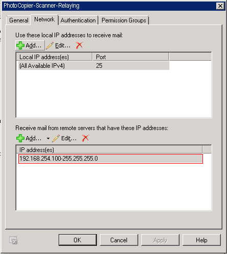 6) In the Receive Emails from the remote host, you can add the IP ADDRESS or RANGE of a PHOTOCOPIER / SCANNER, to whom you want to allow for relaying using Exchange.