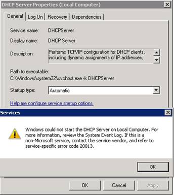 Today I ran into a situation where our remote site server got unexpected shutdown numerous times, due to the power outage happening on the remote site, so after long time when the server came up, and I saw that DHCP Server is not working, so I tried to start the service, but it said same as in the below snapshot: