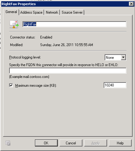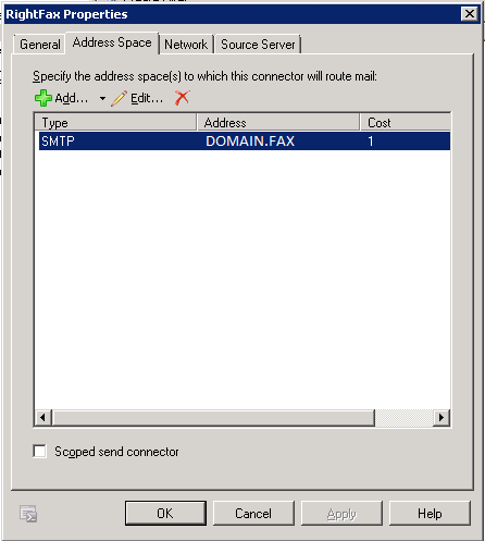 1) Creating required send connector in Exchange Server (HUB) to forward the email messages for DOMAIN.FAX SMTP Namespace to RightFax Server