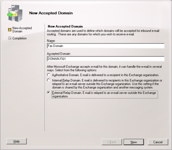 Note: You can have your own created External Relay Domain, like Contoso.Fax or whatever, you just need to add that entry in the Accepted Domain filed, and choose it as External Relay Domain. E-mail is relayed to an e-mail server outside this Exchange Organization.