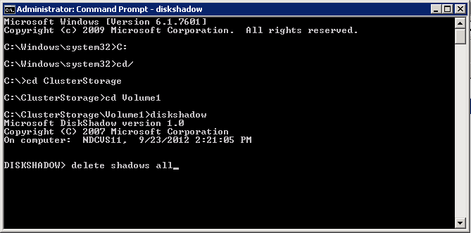 b. Go to the CSV Volume, from where you need to clear the VSS failed snapshot. E.g. C:ClsuterStorageVolume1