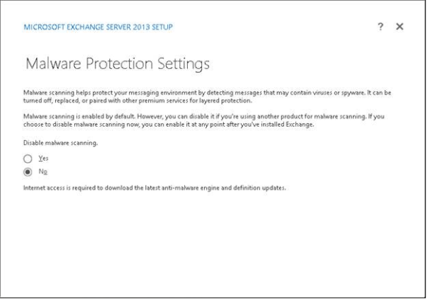 - b. Malware protection settings, Exchange 2013 includes a brand-new enhanced feature for malware protection, by default this feature is enabled on Exchange Mailbox Servers, but if you want you can also disable it.