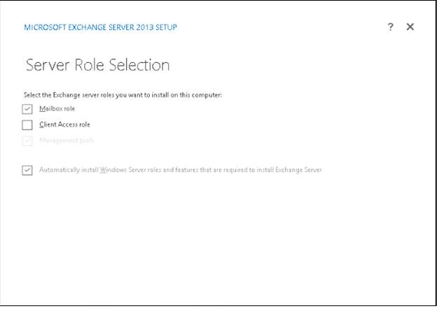 - Server Role Selection window, on this screen we will select the Mailbox role, and will also check the box for saying “Automatically install Windows Server role and features that are required to install Exchange Server”.