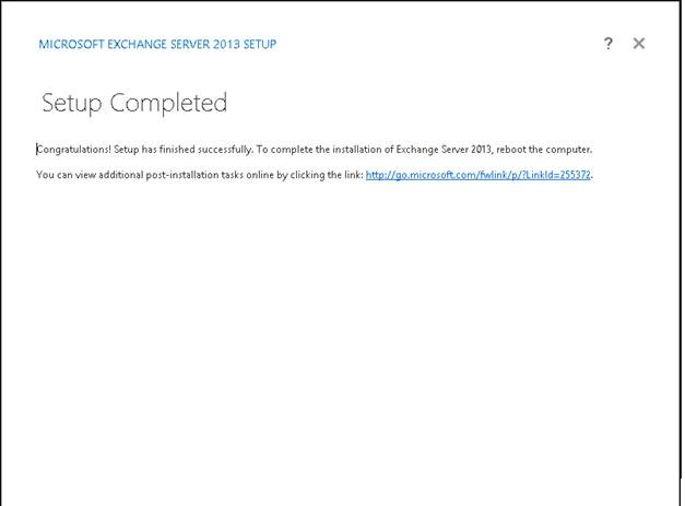 - b. Installing Exchange 2013 binaries, it will take some time to install your Exchange 2013 mailbox server, and once the installation will be finished, setup will notify you about the successful installation completed.