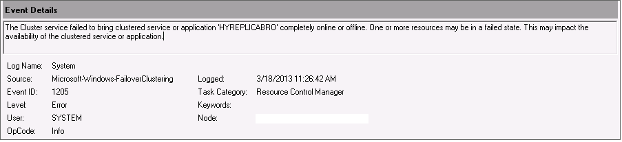 The Cluster service failed to bring clustered service or application ‘HYREPLICABRO’ completed online or offline. One or more resources may be in a failed state. This may impact the availability of the clustered service or application.