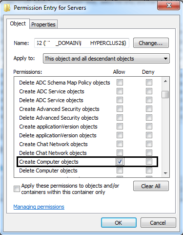5) In the all permission area scroll down and find the entry named “Create Computer objects” and check the box ALLOW.