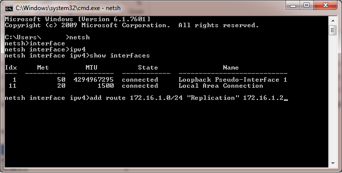 - Now we will add route by executing the command “add route 192.168.2.0/24 “Replication” 192.168.1.1” while remain in the NetSH command shell.