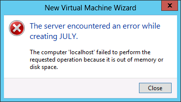 Also when you try to create or delete new virtual machine while having missing Hyper-V exclusions from A/V side, Hyper-V process interruption symptom would look like the below error message: