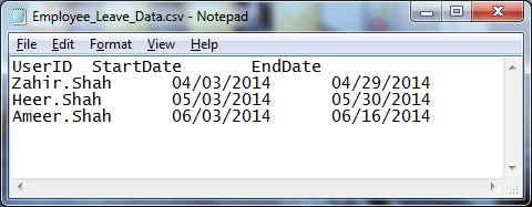You need to configure your ERP system or any other sort of system which has employee leave related data to export following sort of employee leave information into a CSV format (tab delimiter). This location should be accessible by PowerShell script, from my experience I would recommend it should be C:\ drive where I have seen in past that majority of PowerShell related stuff gets handy when they are located in C:\ drive. You can turn on the sharing on this folder for your ERP system to access it when it will export the CSV file. Make a note here that CSV file format is very important, it should be CSV tab delimiter so our PowerShell script can read it.