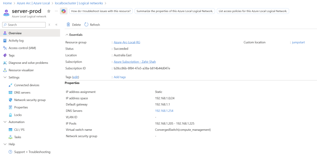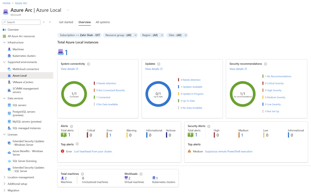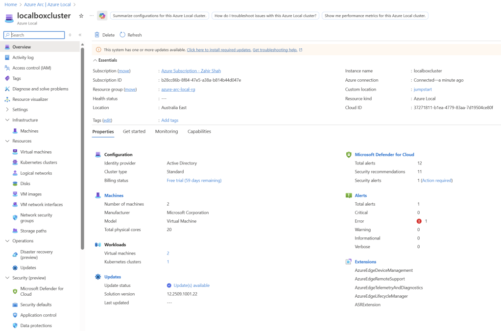 In this lab, I set up a two-node Azure Local cluster using Azure Jumpstart Localbox. A similar lab environment can also be deployed on Hyper‑V. With this two‑node Azure Local setup, I was able to simulate nearly all Azure Local capabilities, including virtual machines, NSGs, images, logical networks, Arc‑enabled Kubernetes, monitoring, disaster recovery, security, and more.