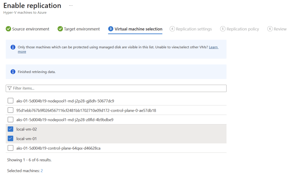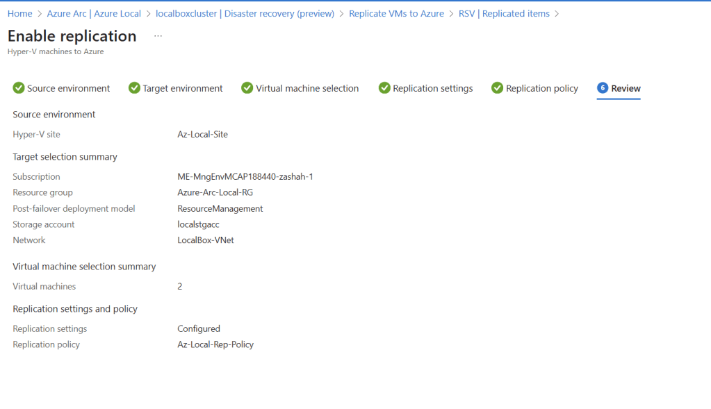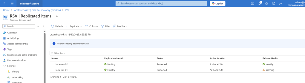 You can see in the below section that, following VMs from Azure Local have been successfully setup for disaster recovery into Azure Recovery Services Vault, and in-case of an actual disaster, these machines can be bring online from Azure: